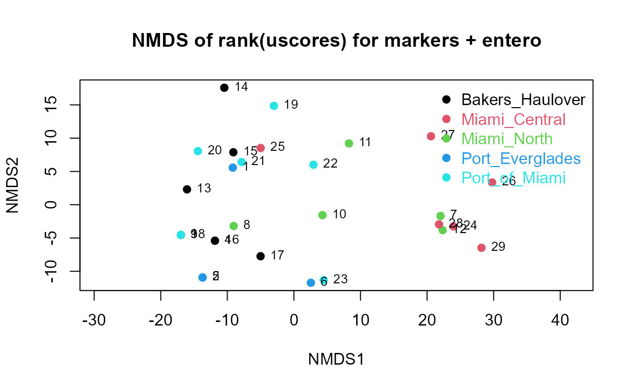 From the left-right axis (NMDS1) we see that all three inlets (Port of Miami, Port Everglades and Baker’s Haulover) are on the left side, while Miami Central, an ocean outfall site, is on the right side. That is the main contrast between sites. From the second axis (NMDS2) there are one or two samples within Sites that are ‘outliers’ towards the top as compared to others in that site. Some characteristic differs in those samples. Sample 11 compared to the rest of Miami_North and site 14 compared to the rest of Baker’s Haulover, for example. Second axes for NMDS aren’t always interpretable, but the first axis should be expected to show the main difference detected by the ANOSIM result.