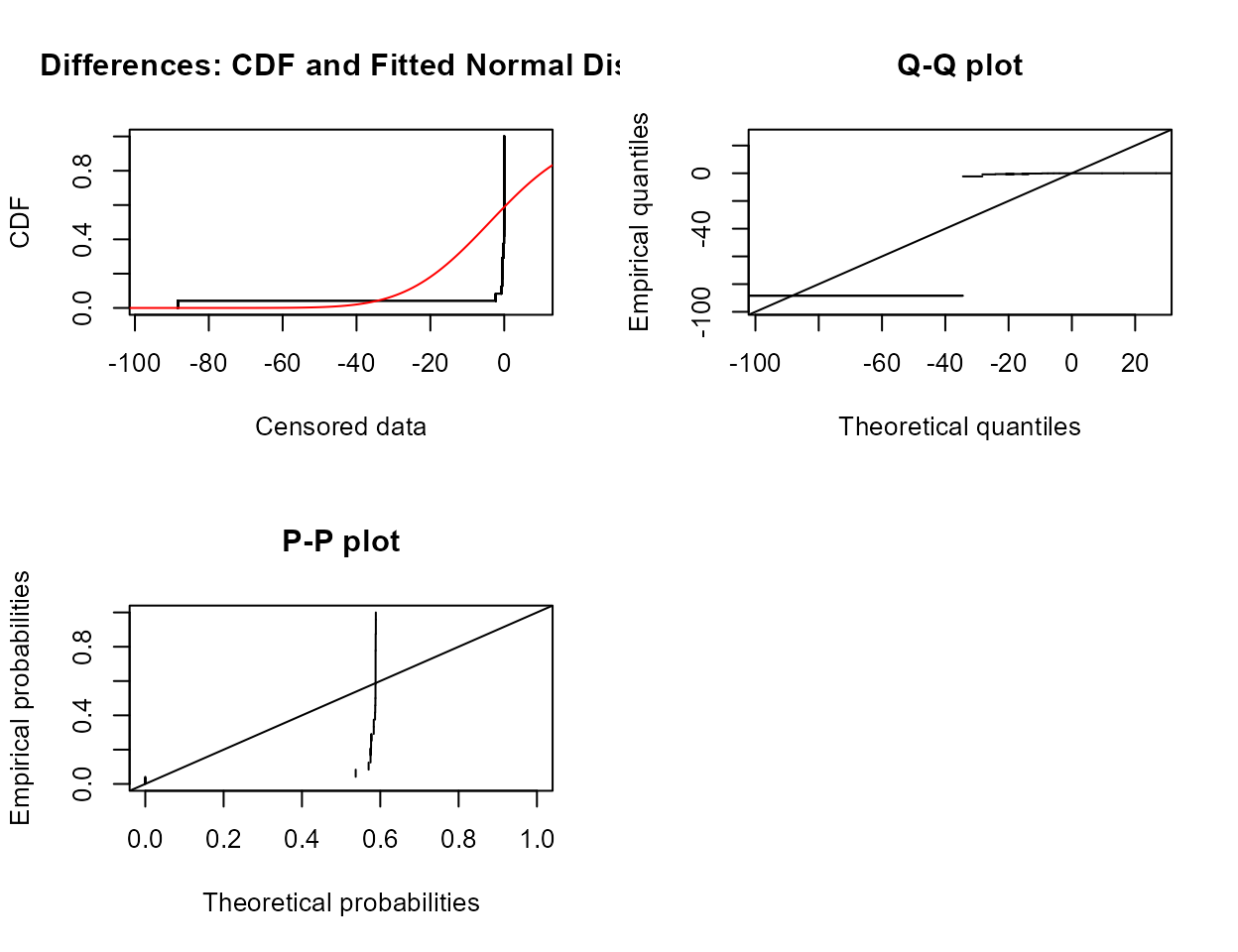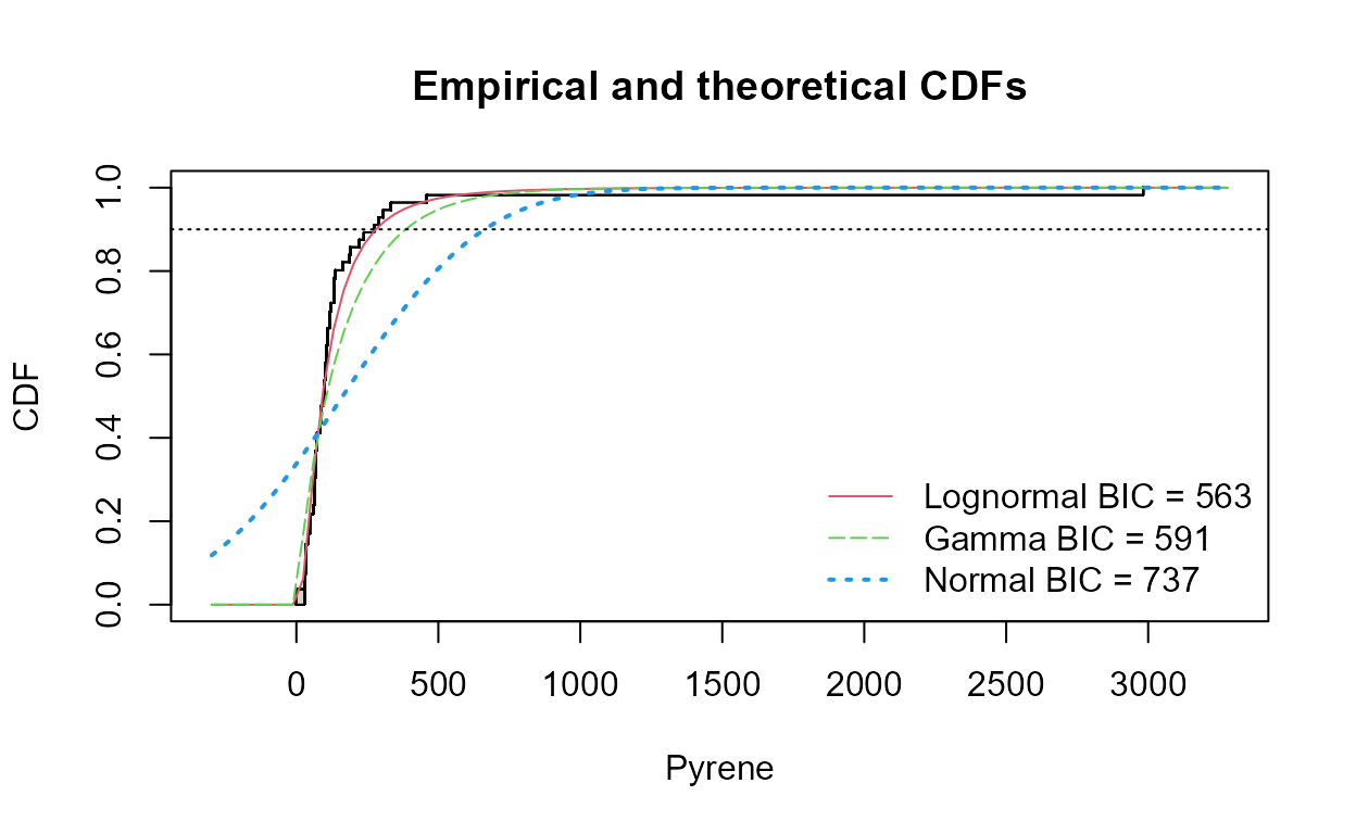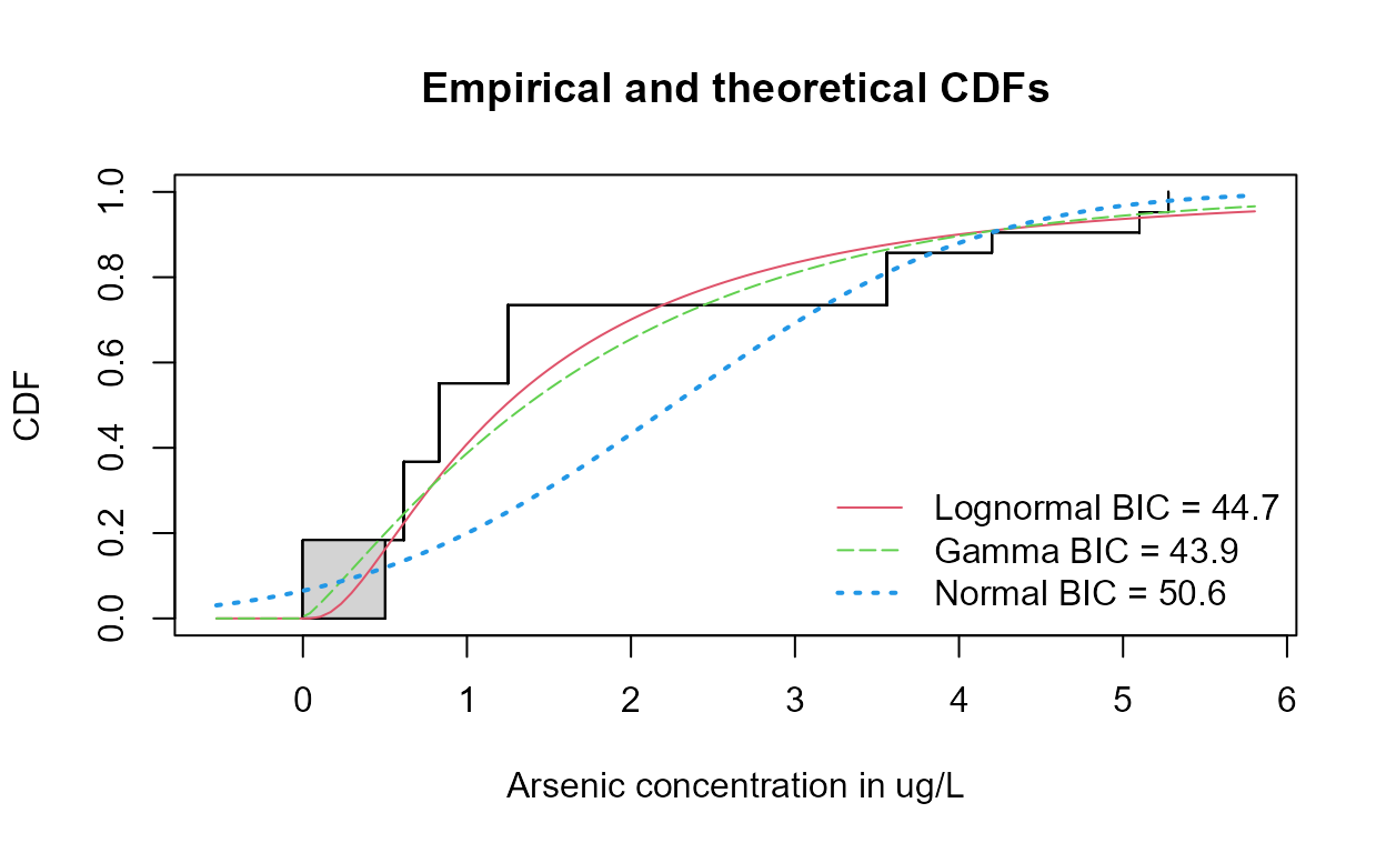 Decide which of three distributions best fits the data using either the cenCompareQQ or cenCompareCdfs function. Of these three, select the distribution with either the highest PPCC or lowest BIC statistic. I prefer the BIC statistic because it better measures the misfit caused by the normal distribution going negative and not matching the 0 lower limit of the data.