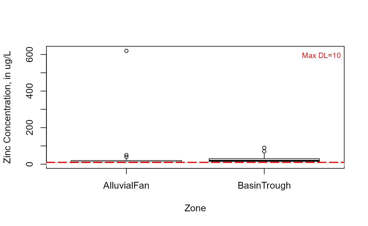cboxplot(CuZn$Zn,CuZn$ZnCen,CuZn$Zone,LOG=TRUE,show = TRUE, minmax = TRUE,