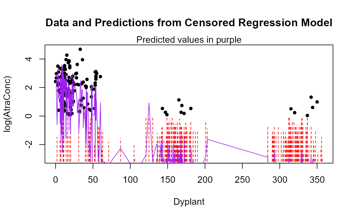The show=TRUE option models the portion of each group’s data below the highest detection limit (the lines in gray) using ROS.